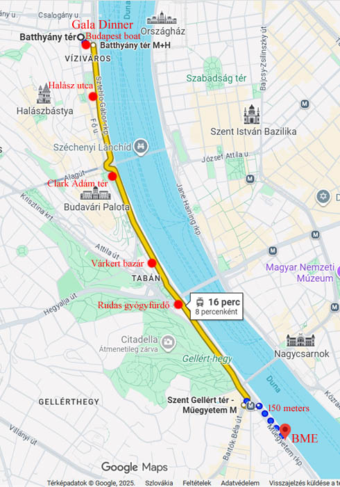 The boat must be boarded and disembarked at Batthyányi Square (5 tram stops from the conference venue) on the Buda side. The boat will stay in the harbor for an hour (during the Award Ceremony), after which the 2-hour spectacular boat trip with dinner will begin.